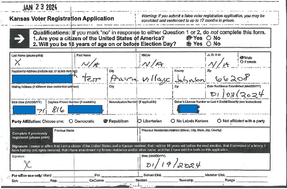 The Johnson County Election Office provided a copy of Mr. X’s voter registration form, which is shown below with some additional redactions (in blue) to not dox this individual. JoCo Election Commissioner Fred Sherman verified in a phone call his office entered all the information from this form into the state’s ELVIS (Election Voter Information System) and it was processed in compliance with all state and federal laws. Advance voting records show Mr. X voted in person the day before the Nov. 5, 2024 election. So, there are no reasons for the Department of Justice to be requesting all Kansas voter data? Secretary of State, Scott Schwab, continues to block the DOJ’s request. Gee, I wonder why?? Ah, Kansas, Land of high taxes and high voter registration rates. 👉 Contribute $100 or more today so my voice can be heard on the KSGOP debate stage in January 2026.